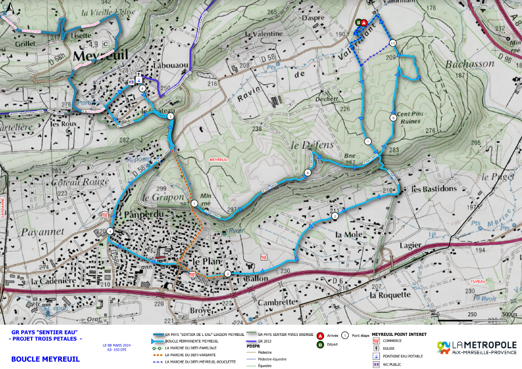La réalisation de ce sentier est le fruit d'un travail commun entre la Municipalité, les associations meyreuillaises, les écoles, Bouches-du-Rhône Tourisme, le Pôle Minier de Gréasque, d'anciens mineurs et des historiens. Cette initiative est née suite au legs du Domaine de Valbrillant en mars 2006 et à l'achat du terril du Défens par la Commune en avril 2008. Le pari réussi a été de préserver les paysages naturels du terril du Défens, entièrement réhabilité et reboisé, en y intégrant l'histoire du bassin minier, notamment le passé minier de Meyreuil. Ce nouveau lieu de promenade donne désormais la possibilité de pratiquer une activité physique et culturelle en famille, entre amis, au cours de sorties scolaires ou de programme des centres de Loisirs. |